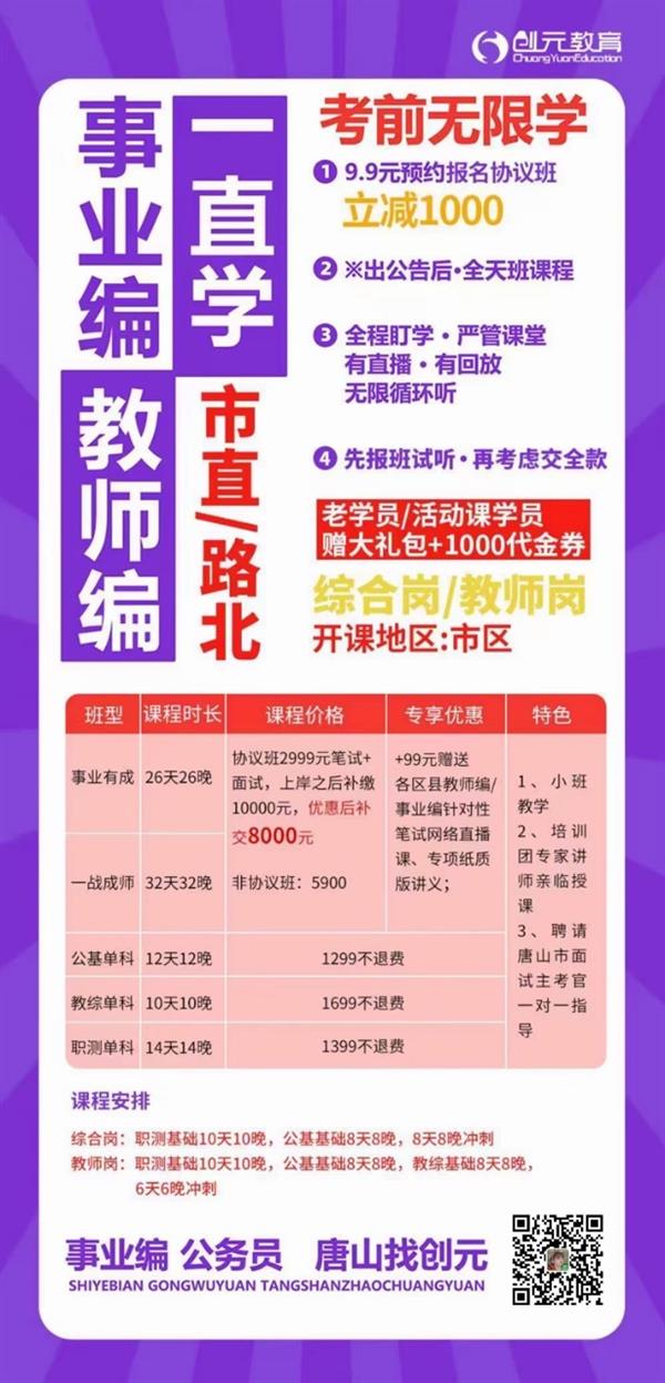 看了上述内容,各位是否也对唐山创元教育教资面试班产生兴趣了呢?除此之外,唐山创元教育还开设有省考、国考、事业编等诸多课程班。各位对公务员考试感兴趣的同学可以扫描下方二维码进行咨询。